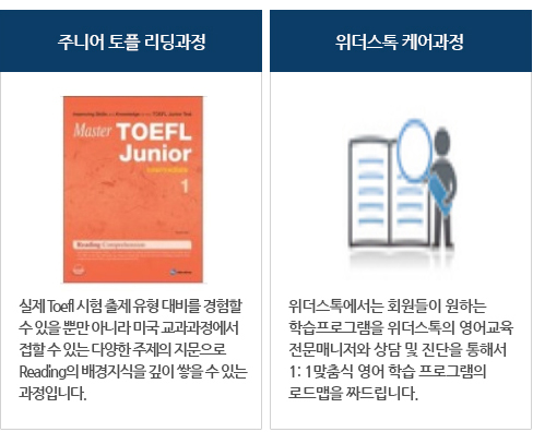 중고등 과정에서는 중고급단계의 회원들을 위한 다양하고 체계적인 회화교재 활용으로 영어에 대한 완성을 목표로 합니다. 이와 함께 주어진 지문을 읽고 자신이 생각과 주장을 원어민강사와의 1:1 수업을 통해 논리적이고 명확한 이유를 제시할 수 있는 연습과 훈련하는 과정인 토론(Debating & Discussing) 과정을 통해 비판적사고력인 "CriticalThinking' 능력을 키움니다. 이는 iBT Toefl과 미국대학입학시험인 SAT를 준비하는 데 있어 기초를 쌓아가는 첫 과정일 것입니다.